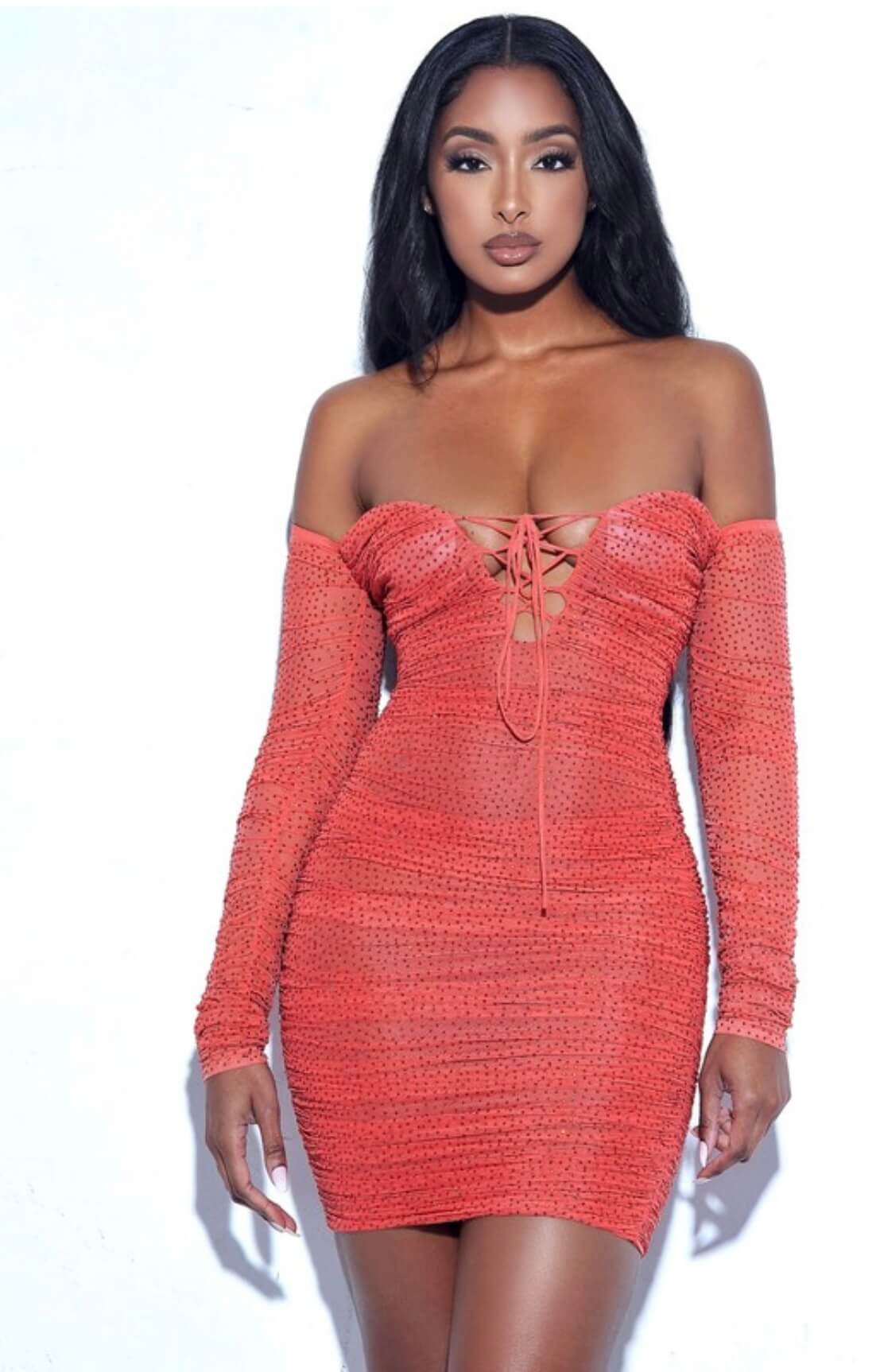 Embrace your curves in our Coral Charm Off-Shoulder Ruched Dress. Ideal for birthdays, social events, and girls’ nights out, this dress features lace-up details and figure-enhancing ruching.