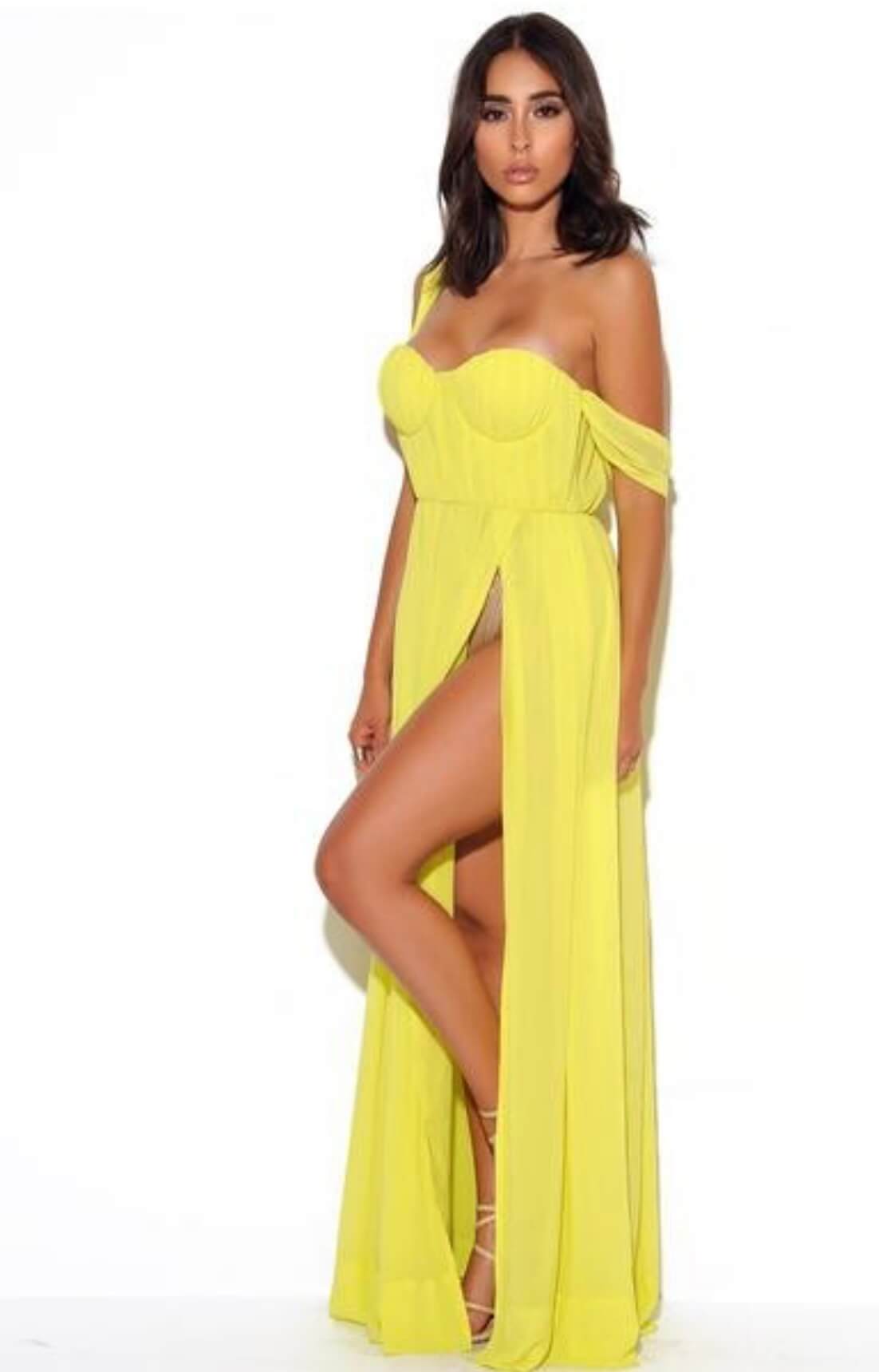 Feel like a goddess in our Lemon Chiffon Maxi Dress. Featuring a corset-style bust, high-leg slit, and flowing chiffon fabric, it’s ideal for weddings, romantic dinners, and beach vacations.